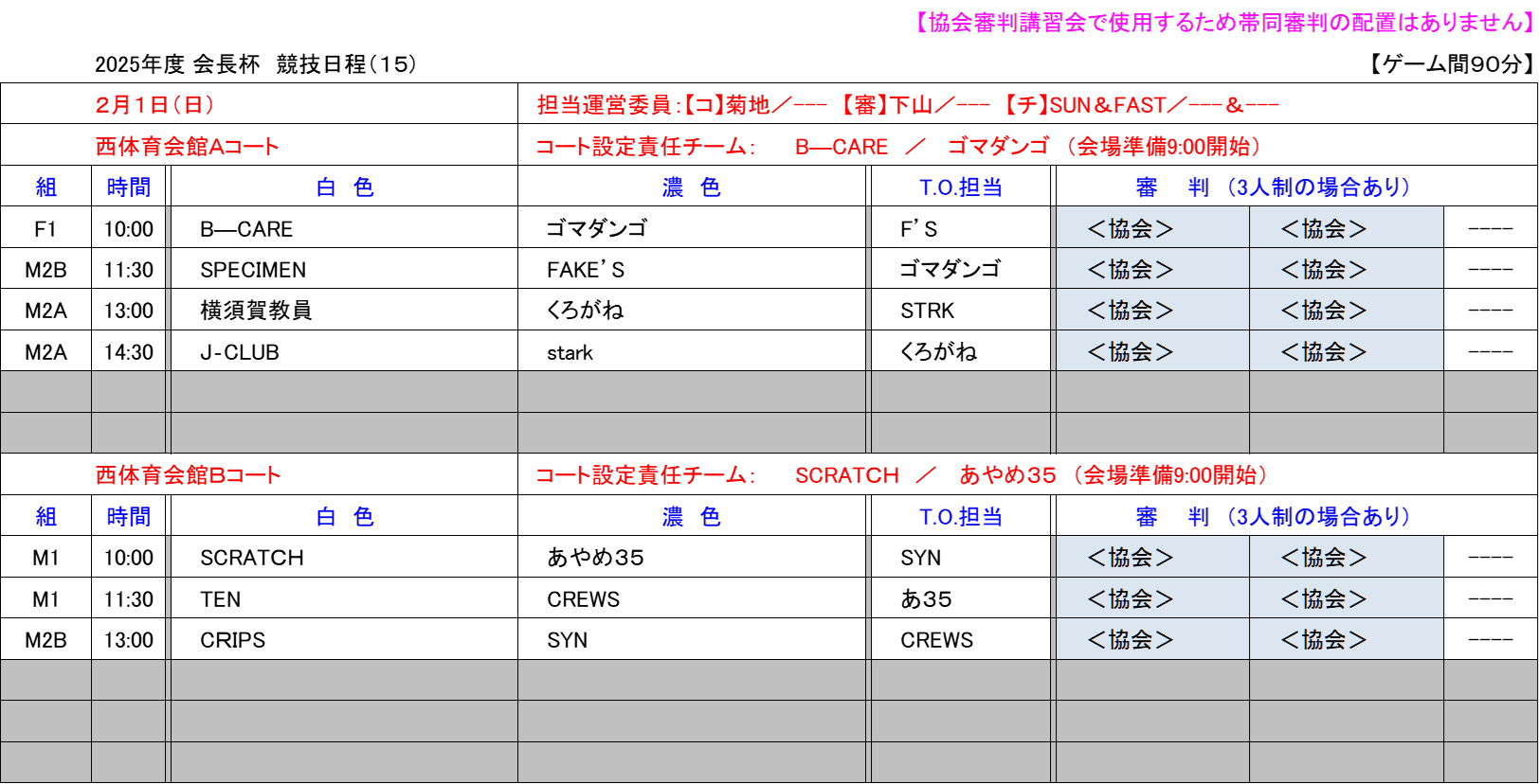 2025年度会長杯 第15日目(2026/2/1)ですが、予定していた協会の審判講習に使用するため、帯同審判の割り当てを行わないこととしました。