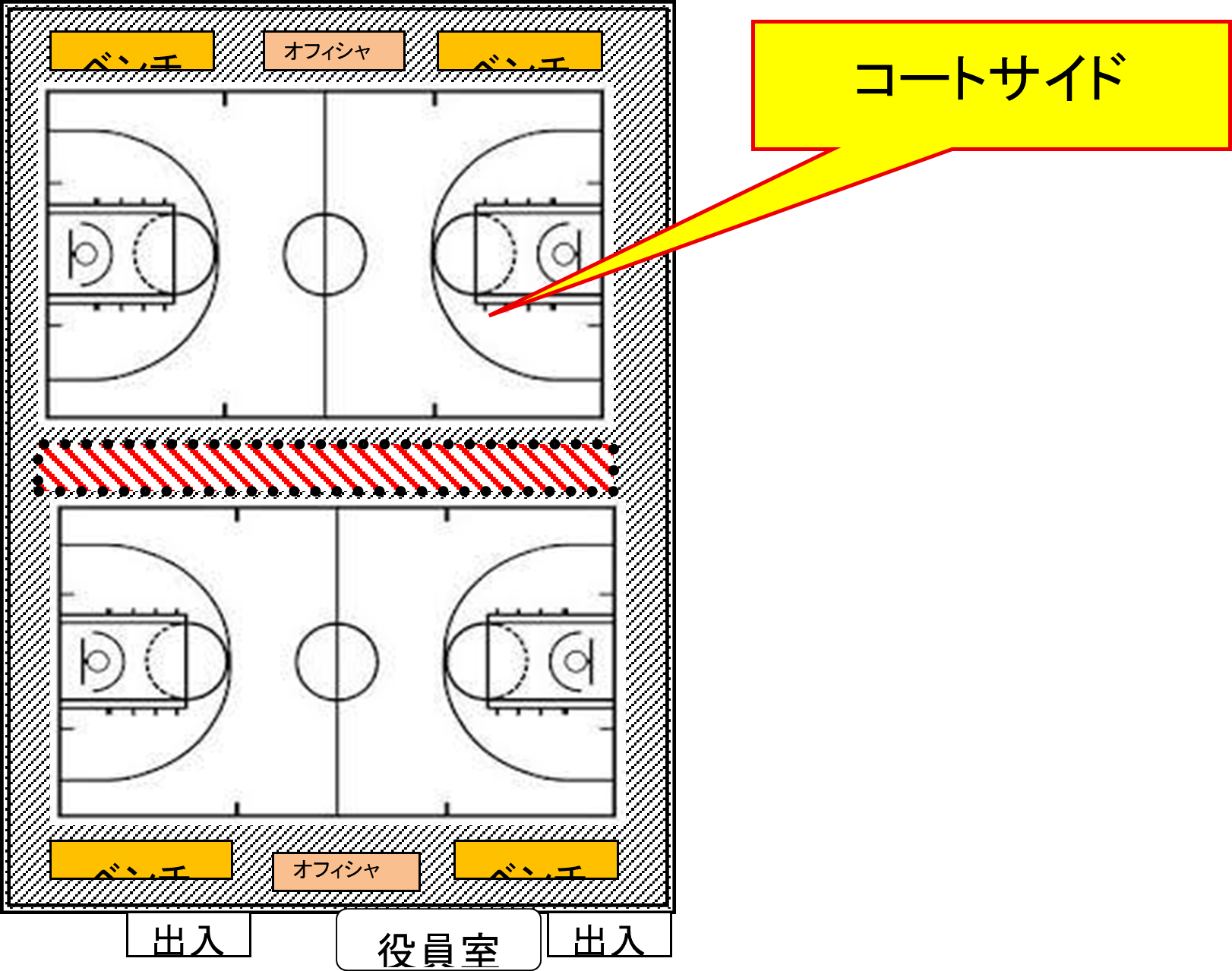 | <大会プログラムより> 次のゲームのチーム登録者のみ、ハーフタイムのアップのため前半終了3分前よりコートサイドでの待機を認めます。この場合、コートサイドでは当該ゲームの妨げにならないように待機をお願いします。ストレッチ・ボールを使う等の行為は禁止します。 また、次のゲームへの準備等も後半終了3分前よりコートサイドでの待機を認めます。こちらもストレッチ・ボールを使う等の行為は禁止します。前のゲームが棄権等によりない場合でも、役員が指定する時刻(ゲームがあった場合のおおよその終了時刻を目安とする)よりも前には、立ち入らないでください。 |